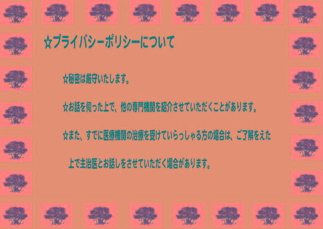 プライバシポリシーについて 秘密は厳守いたします。 お話を伺った上で、他の専門機関を紹介させていただくことがあります。 また、すでに医療機関の治療を受けていらっしゃる方の場合は、ご了解をえた上で主治医とお話をさせていただく場合があります。
